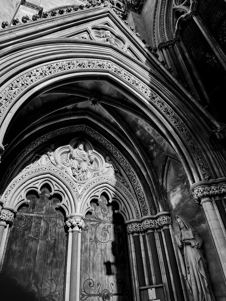 Arched and gabled entrance and doors to St John’s College Chapel